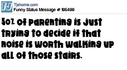 X says 50% of parenting is just trying to decide if that noise is worth walking up all of those stairs.