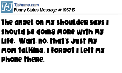 X says The angel on my shoulder says I should be doing more with my life. Wait, no, that's just my mom talking. I forgot I left my phone there.