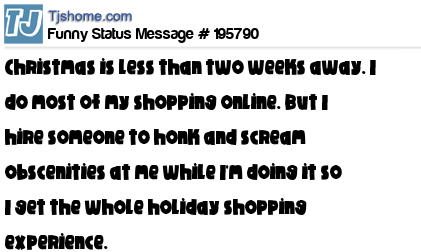 X says Christmas is less than two weeks away. I do most of my shopping online. But I hire someone to honk and scream obscenities at me while I'm doing it so I get the whole holiday shopping experience.