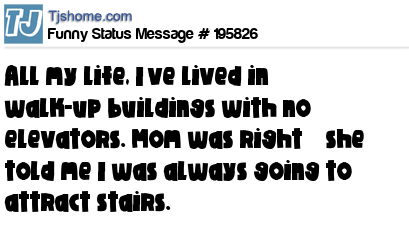 X says All my life, I’ve lived in walk-up buildings with no elevators. Mom was right – she told me I was always going to attract stairs.