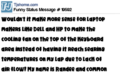 X Wouldn't it make more sense for laptop makers like Dell and HP to make the cooling fan on the top of the keyboard area instead of having it reach searing temperatures on my lap due to lack of air flow? My name is Randee and common sense was my idea