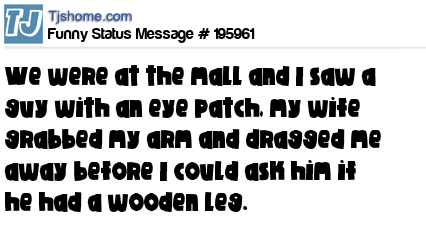 X says We were at the mall and I saw a guy with an eye patch, my wife grabbed my arm and dragged me away before I could ask him if he had a wooden leg.