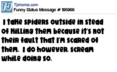 X says I take spiders outside in stead of killing them because it's not their fault that I'm scared of them. I do however, scream while doing so.