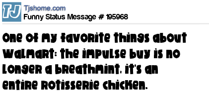 X says One of my favorite things about Walmart: the impulse buy is no longer a breathmint, it's an entire rotisserie chicken.