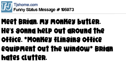 X says Meet Brian, my monkey butler. He's gonna help out around the office. *Monkey flinging office equipment out the window* Brian hates clutter.