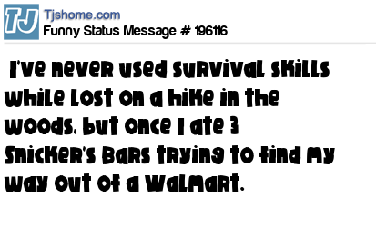 X says I've never used survival skills while lost on a hike in the woods, but once I ate 3 Snicker's Bars trying to find my way out of a Walmart.