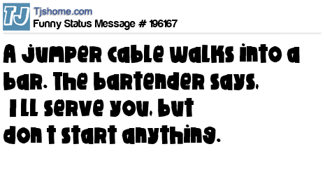 - # 170744 A jumper cable walks into a bar. The bartender says, "I'll serve you, but don't start anything."