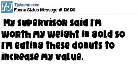 X says My supervisor said I'm worth my weight in gold so I'm eating these donuts to increase my value.