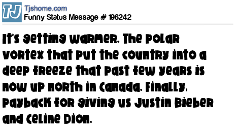 X says It's getting warmer. The polar vortex that put the country into a deep freeze that past few years is now up north in Canada. Finally, payback for giving us Justin Bieber and Celine Dion.