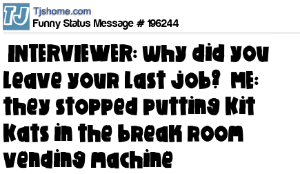 X says INTERVIEWER: why did you leave your last job? ME: they stopped putting Kit Kats in the break room vending machine
