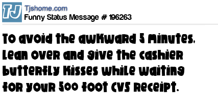 X says To avoid the awkward 5 minutes, lean over and give the cashier butterfly kisses while waiting for your 500 foot CVS receipt.