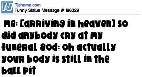 X says me: [arriving in heaven] so did anybody cry at my funeral god: oh actually your body is still in the ball pit