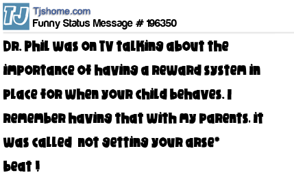 X says Dr. Phil was on TV talking about the importance of having a reward system in place for when your child behaves. I remember having that with my parents, it was called “not getting your arse* beat”!
