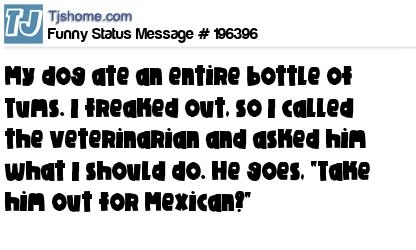X says My dog ate an entire bottle of Tums. I freaked out, so I called the veterinarian and asked him what I should do. He goes, "Take him out for Mexican?"