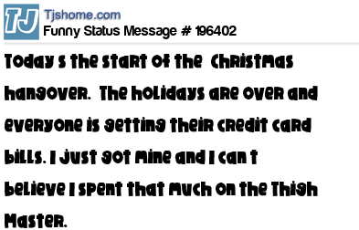 X says Today’s the start of the “Christmas hangover.” The holidays are over and everyone is getting their credit card bills. I just got mine and I can’t believe I spent that much on the Thigh Master.
