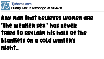 - # 87311 Any man that believes women are "the weaker sex" has never tried to reclaim his half of the blankets on a cold winter's night.