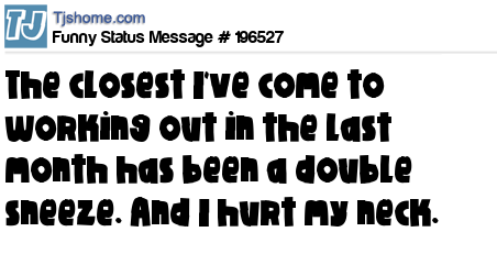 X says The closest I've come to working out in the last month has been a double sneeze. And I hurt my neck.