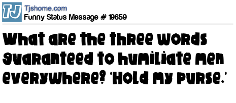 - # 20500 What are the three words guaranteed to humiliate men everywhere? 'Hold my purse.'