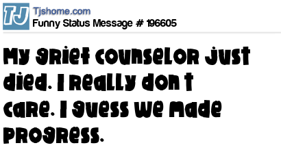 X says My grief counselor just died. I really don’t care. I guess we made progress.