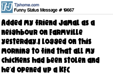X has added my friend Jamal as a neighbour on Farmville yesterday.I logged on this morning to find that all my chickens had been stolen and he'd opened up a KFC