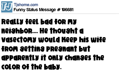 X says Really feel bad for my neighbor.... He thought a vasectomy would keep his wife from getting pregnant but apparently it only changes the color of the baby.