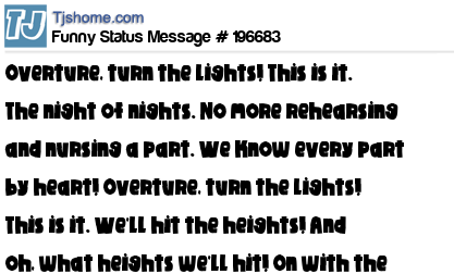 X says Overture, turn the lights! This is it. The night of nights. No more rehearsing and nursing a part. We know every part by heart! Overture, turn the lights! This is it. We'll hit the heights! And oh, what heights we'll hit! On with the show, this is it!
