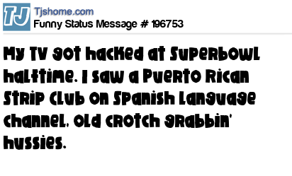 X is My TV got hacked at Superbowl halftime. I saw a Puerto Rican Strip Club on Spanish language channel, old crotch grabbin' hussies.