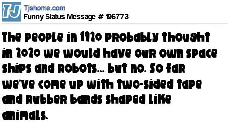 X says The people in 1920 probably thought in 2020 we would have our own space ships and robots... but no. So far we've come up with two-sided tape and rubber bands shaped like animals.