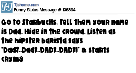 X says Go to Starbucks. Tell them your name is Dad. Hide in the crowd. Listen as the hipster barista says "Dad?..Dad?..DAD?..DAD?!" & starts crying