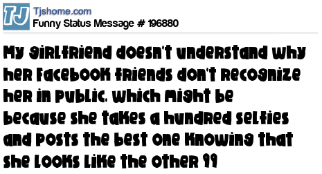 X is My girlfriend doesn't understand why her Facebook friends don't recognize her in public, which might be because she takes a hundred selfies and posts the best one knowing that she looks like the other 99