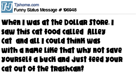 X says When I was at the Dollar Store, I saw this cat food called “Alley Cat” and all I could think was with a name like that why not save yourself a buck and just feed your cat out of the trashcan?