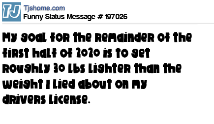 X says My goal for the remainder of the first half of 2020 is to get roughly 30 lbs lighter than the weight I lied about on my drivers license.