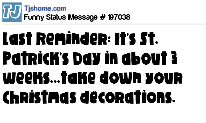 X says Last Reminder: It's St. Patrick's Day in about 3 weeks...take down your Christmas decorations.