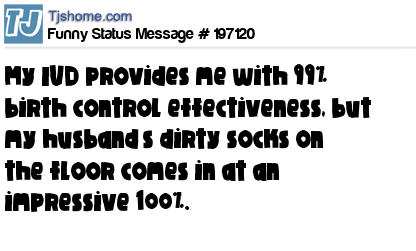 X says My IUD provides me with 99% birth control effectiveness, but my husband’s dirty socks on the floor comes in at an impressive 100%.