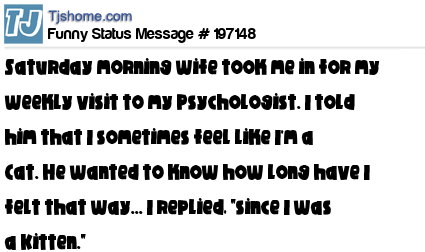 - # 165085 I went in for my weekly visit to my Psychologist. I told him that I sometimes feel like I'm a Cat. He wanted to know how long have I felt that way... I replied, "since I was a Kitten."