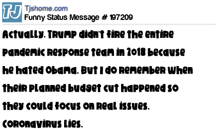- # 197203 Remember when Trump fired the entire pandemic response team in 2018 because he hated Obama? Coronavirus remembers.