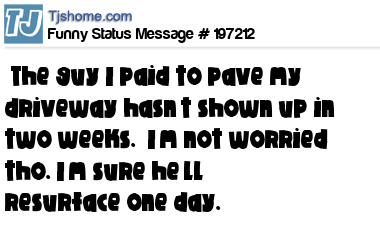 X says The guy I paid to pave my driveway hasn’t shown up in two weeks. I’m not worried tho. I’m sure he’ll resurface one day.