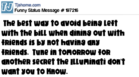 X says The best way to avoid being left with the bill when dining out with friends is by not having any friends. Tune in tomorrow for another secret the Illuminati don't want you to know.