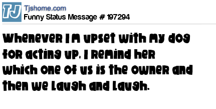 X says Whenever I’m upset with my dog for acting up, I remind her which one of us is the owner and then we laugh and laugh.