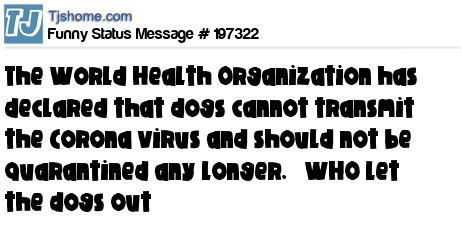 - # 197426 The World Health Organization came out today and said that dogs are immune from the COVID-19 virus, and that any dogs that have been placed in quarantine can be released. So to be clear....WHO let the dogs out.