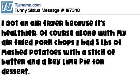 X says I got an air fryer because it's healthier. Of course along with my air fried pork chops I had 5 lbs of mashed potatoes with a stick of butter and a Key Lime Pie for dessert.
