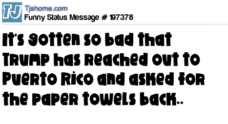 - # 197362 Since the stores are all sold out... I'm thinking maybe Trump can get us some of those paper towels back he gave to Puerto Rico.