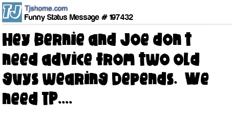 X is Hey Bernie and Joe don’t need advice from two old guys wearing Depends. We need TP....
