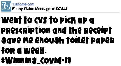 X is Went to CVS to pick up a prescription and the receipt gave me enough toilet paper for a week. #Winning_Covid-19