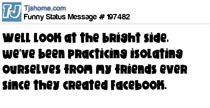 X is Well look at the bright side, we've been practicing isolating ourselves from my friends ever since they created Facebook.