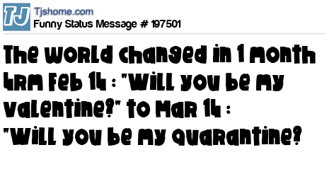 X is The world changed in 1 month 4rm Feb 14 : "Will you be my valentine?" to Mar 14 : "Will you be my quarantine?