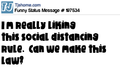 - # 197566 WTF, everyone is talking about social distancing rule...Haven't we been doing that since we opened facebook accounts?