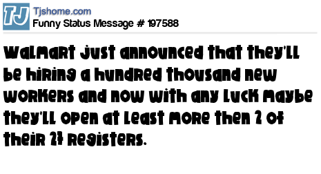 X is Walmart just announced that they'll be hiring a hundred thousand new workers and now with any luck maybe they'll open at least more then 2 of their 27 registers.