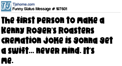 X says The first person to make a Kenny Roger's Roasters cremation joke is gonna get a swift... never mind. It's me.