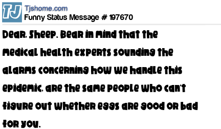 X says Dear, Sheep. Bear in mind that the medical health experts sounding the alarms concerning how we handle this epidemic, are the same people who can't figure out whether eggs are good or bad for you.